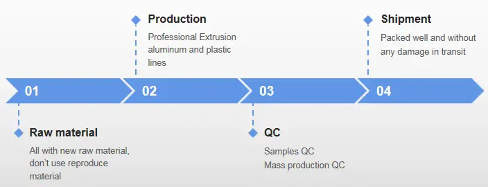 जेई नेहमीच अॅल्युमिनियम आणि प्लास्टिकच्या कच्च्या मालापासून एक्सट्रूझन प्रॉडक्शन लाइनपर्यंतच्या उत्पादनांच्या पात्रतेवर लक्ष केंद्रित करते, नमुने गुणवत्ता नियंत्रणापासून मोठ्या प्रमाणात उत्पादन नियंत्रणापर्यंत, मजबूत परिपूर्ण पॅकेजपासून संपूर्ण-हृदय सेवेपर्यंत.